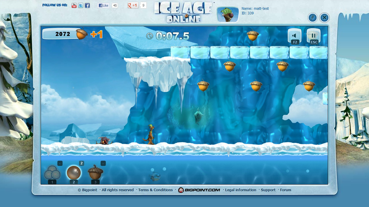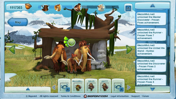 Ice Age Online was a free-to-play online game by German developer Bigpoint. It is not playable anymore. As Sid you run, jump and fly through the world of Ice Age and collect acorns. Those can be used to upgrade your camp.