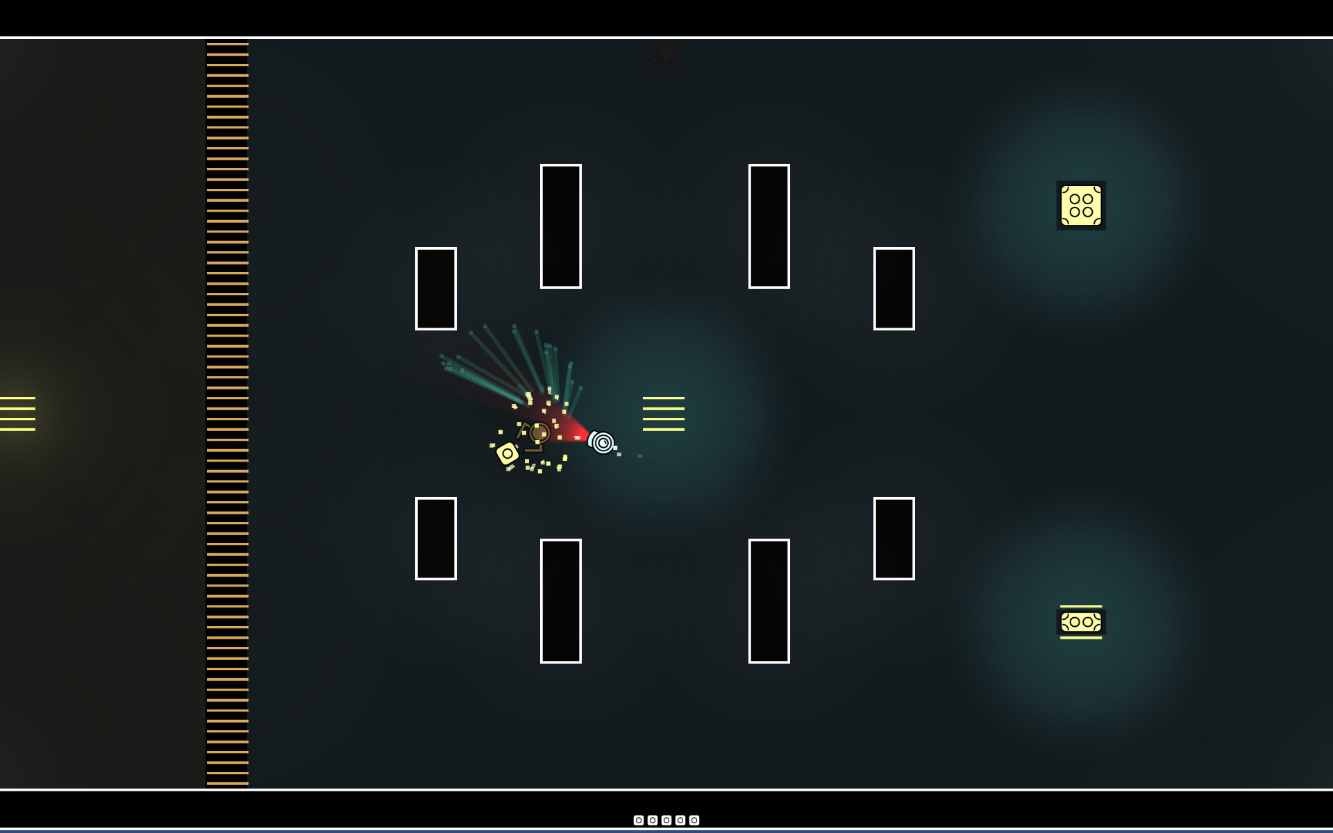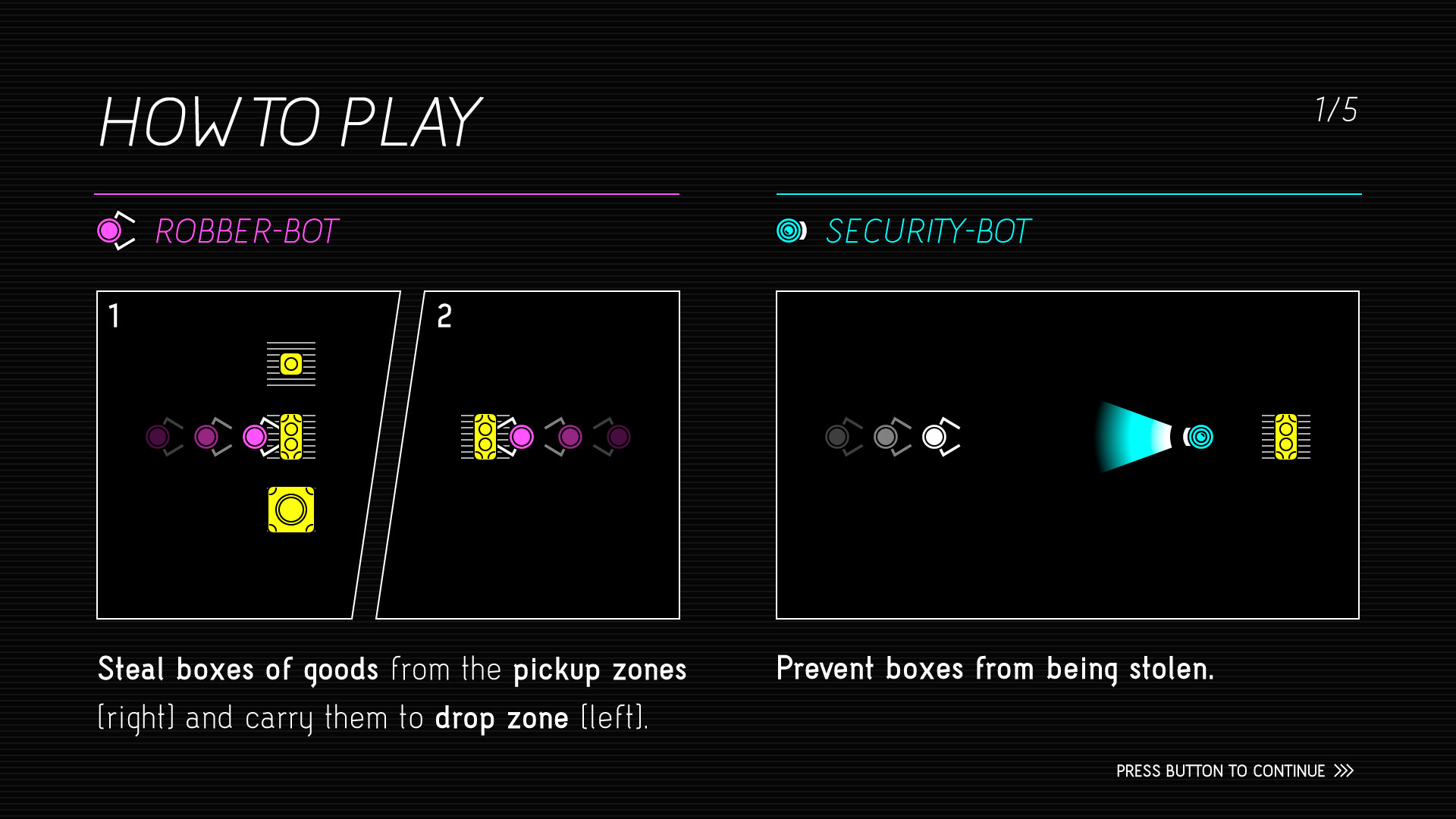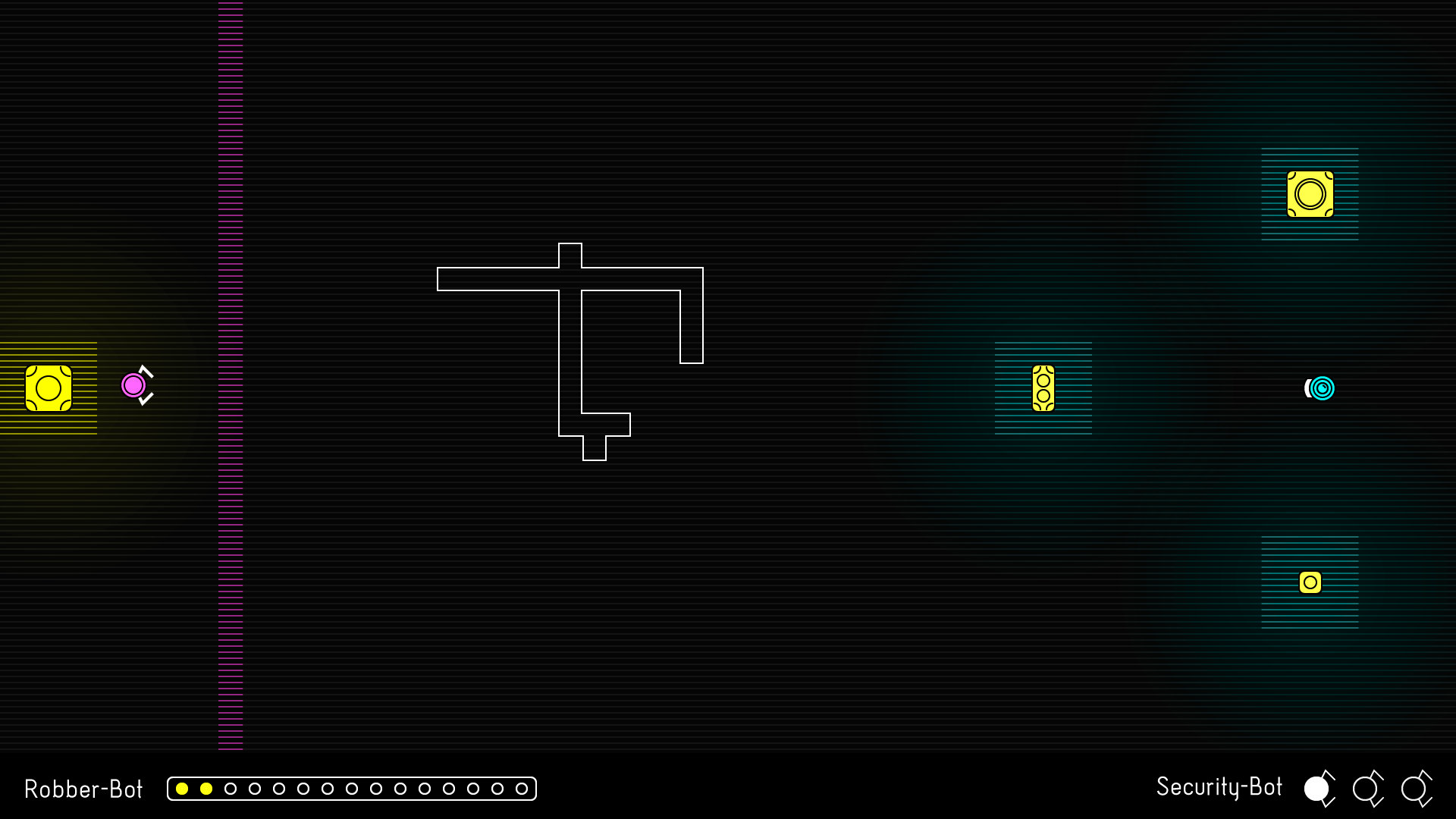 Robo Robbers is a two-plaer heist game. One players takes the role of a robber-bot that has to collect crates and bring them to a target area. The second player controls a security-bot that has to prevent crates from being stolen. However, there is one important detail: The robber-bot is invisible, even to the player who controls it. Only when the it is near a light-source or carrying a crate, the bot becomes visible.